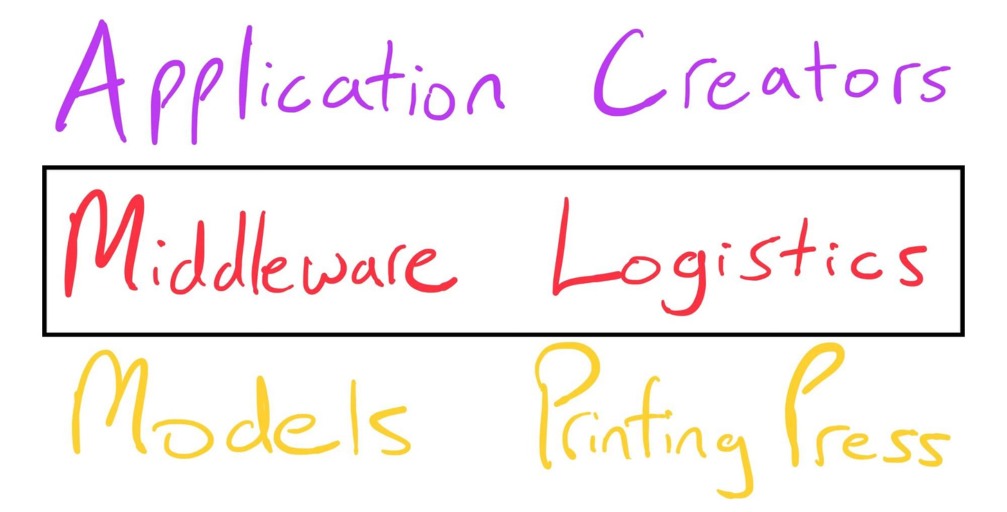 In line with what happened to the printing press, a level of commoditization of AI foundation models already appears to be occurring. While it is interesting to follow the models’ technological “bake off”, where a new model lands on top seemingly every week, I find that the layers sitting on top of foundation models—middleware and applications— are overlooked and more interesting, respectively.